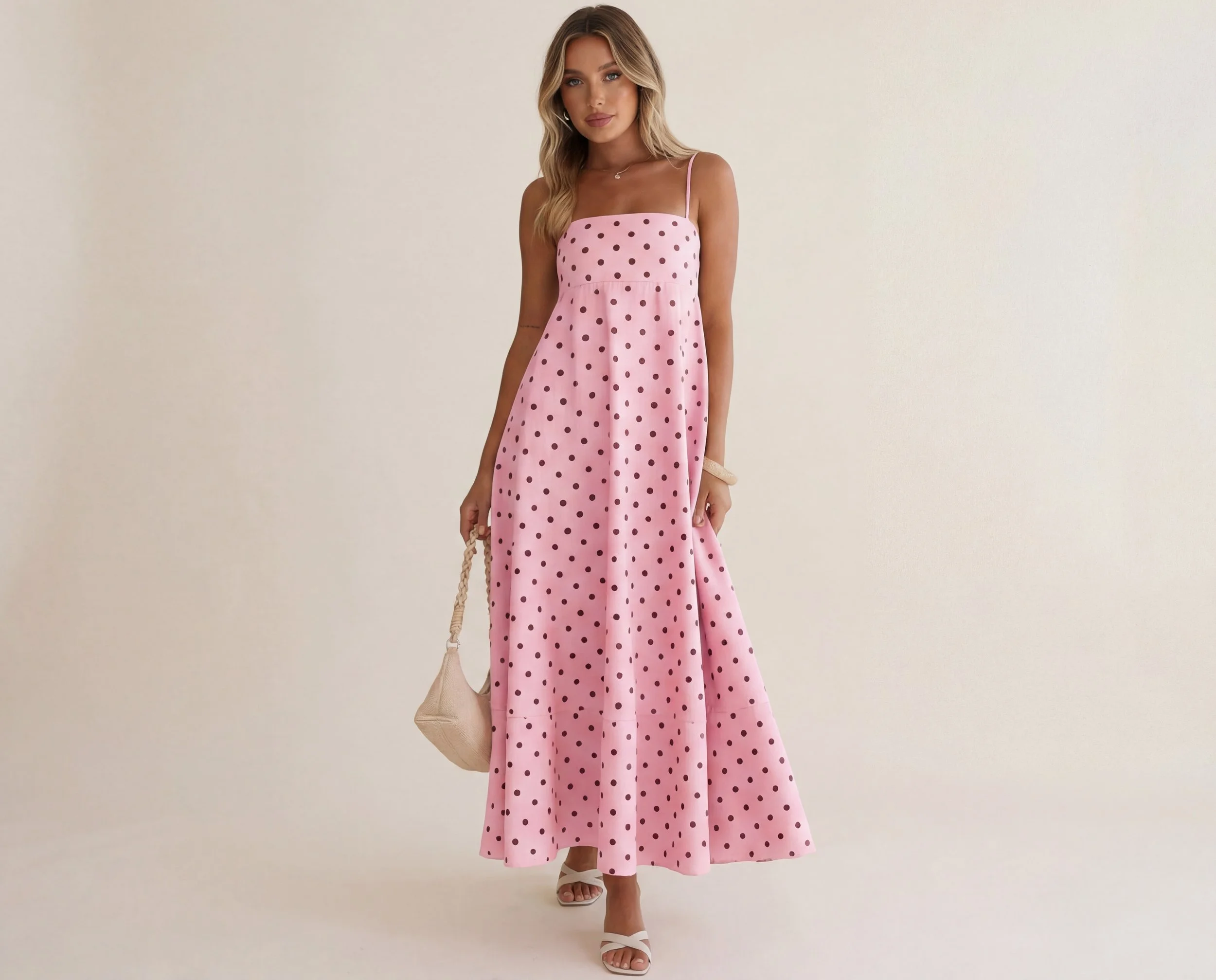 Polka dots bring a timeless charm to any outfit. This pink midi dress combines vintage inspiration with a modern feminine look.