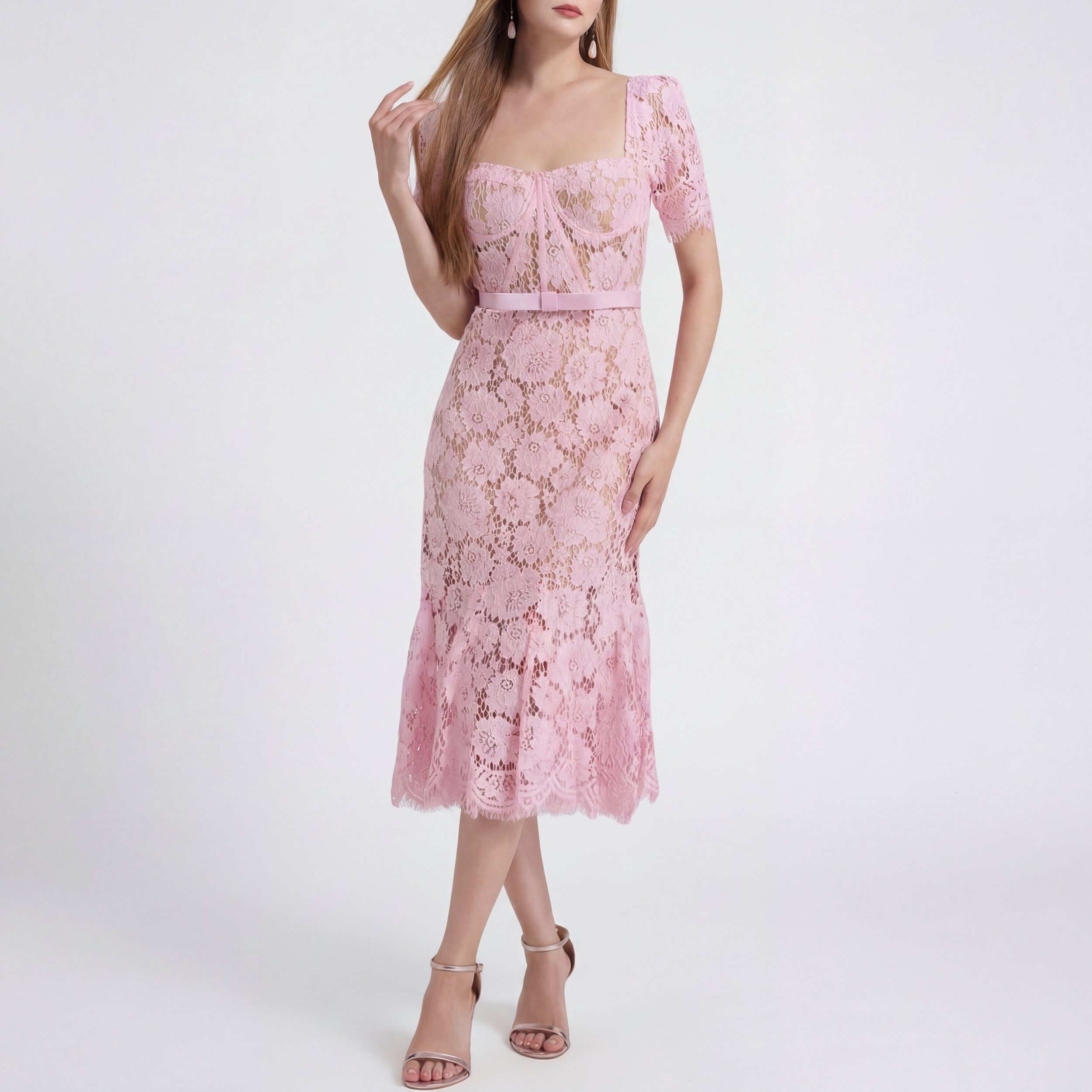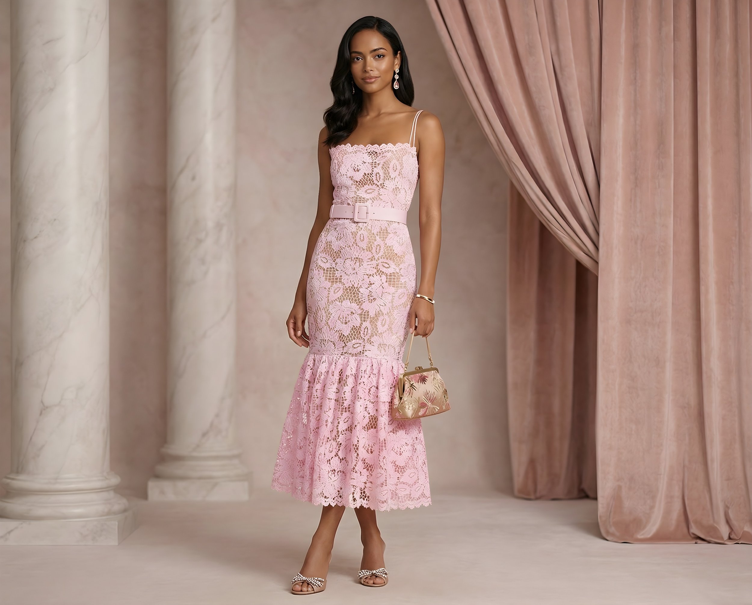 This lace pink dress creates a romantic and elegant silhouette. The delicate texture and soft color make it perfect for weddings, special events or chic summer evenings.