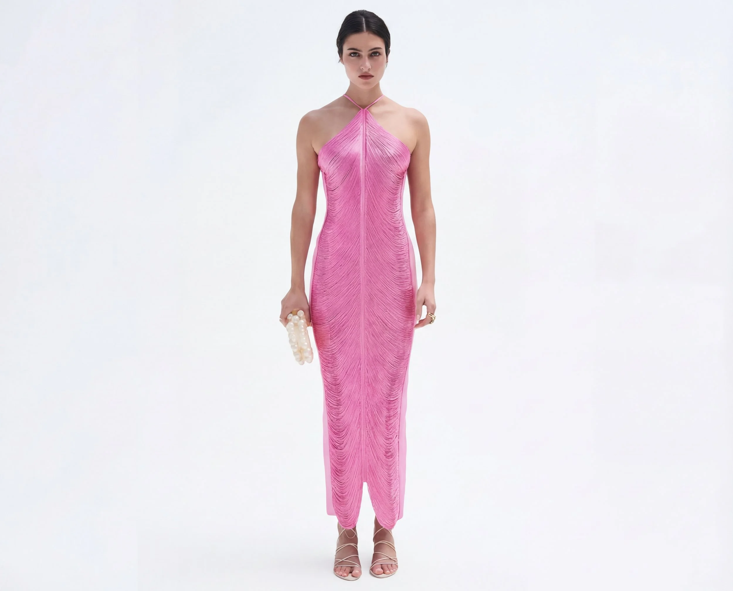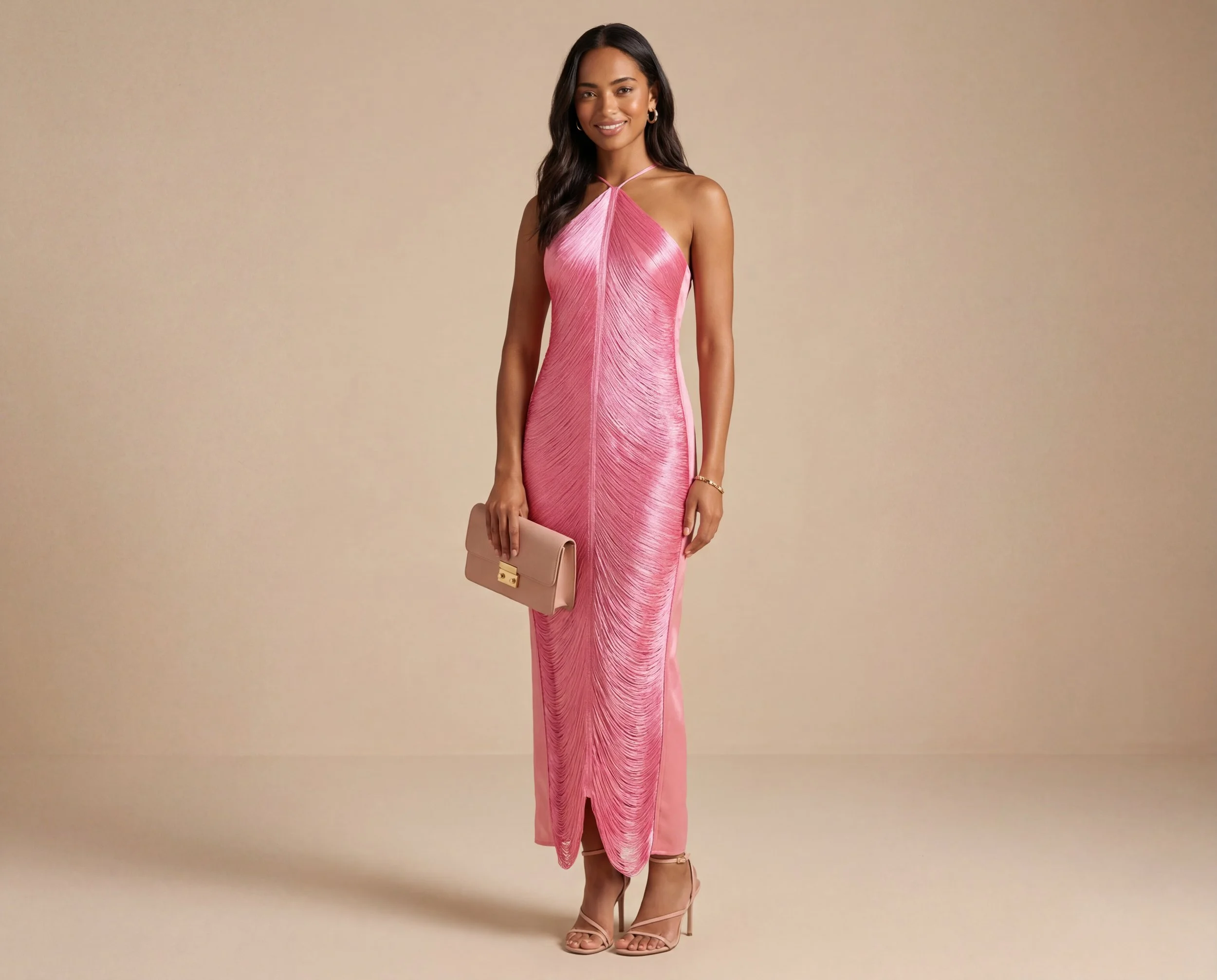 This elegant pink halter dress stands out with its delicate draped texture and sleek silhouette. The structured halter neckline creates a refined and sophisticated look while the flowing lines of the fabric add movement and elegance.