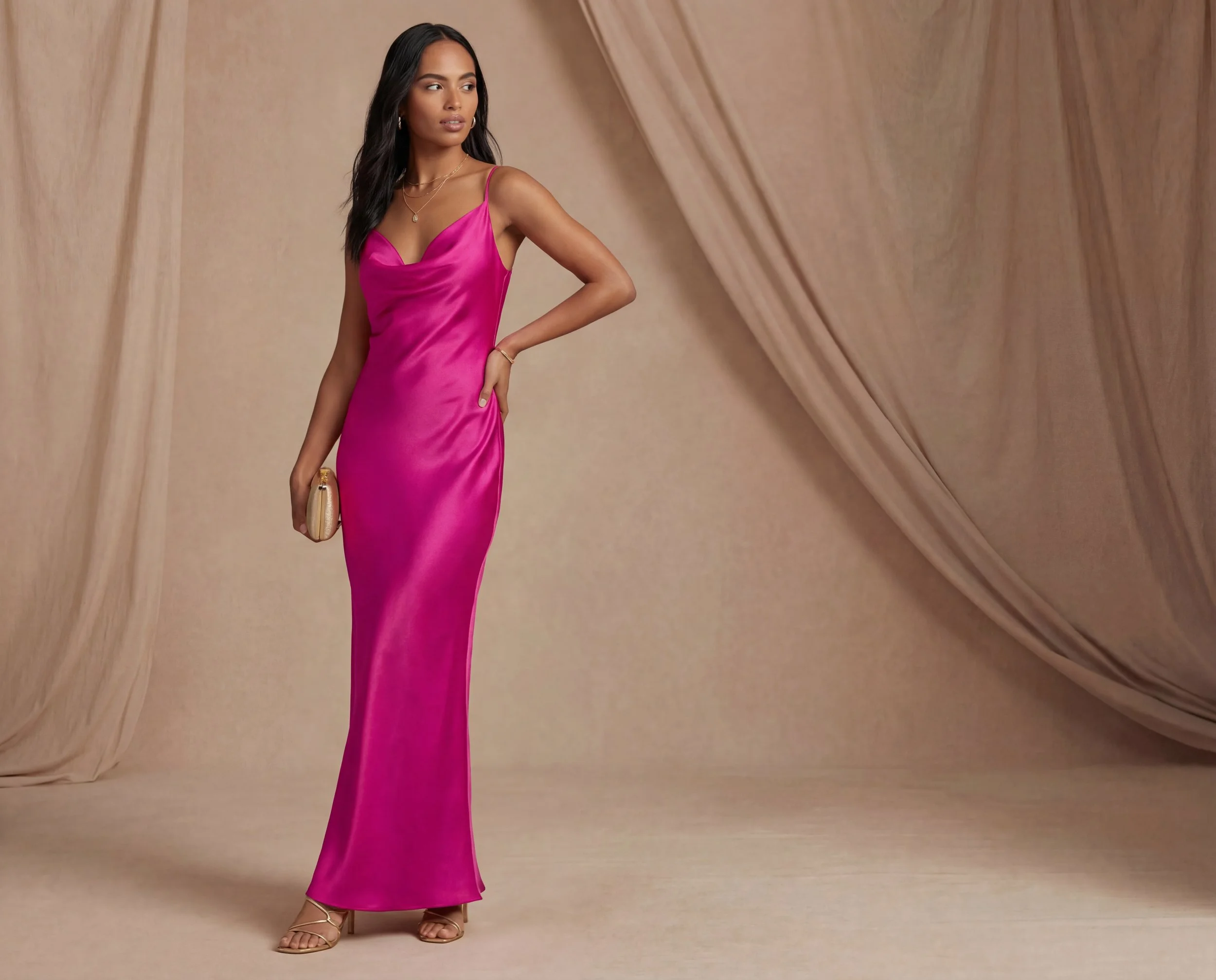 This vibrant pink satin dress creates a striking and elegant silhouette. The fluid fabric and sleek design bring a refined, modern touch that works beautifully for evening events, weddings, or sophisticated summer occasions.
